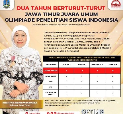 Dampaknya, jumlah siswa Jatim yang diterima perguruan tinggi tanpa tes (SNBP) berada di posisi tertinggi di tingkat nasional, hingga raihan juara Olimpiade Sains Nasional sejak 2020 sampai 2022.