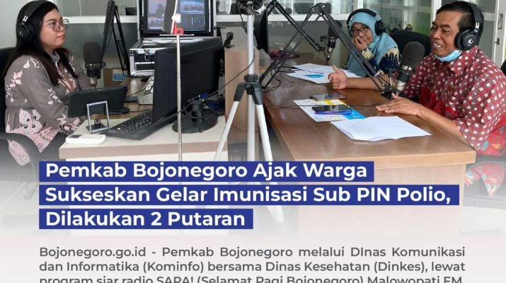 Cahayabaru.id, Bojonegoro – Pemkab Bojonegoro melalui Dinas Komunikasi dan Informatika (Kominfo) bersama Dinas Kesehatan (Dinkes), lewat program siar radio SAPA! (Selamat Pagi Bojonegoro) Malowopati FM, mengajak masyarakat menyukseskan imunisasi sub PIN polio. Program siar radio  dilakukan Jumat (12/1/2024) dengan dipandu penyiar Lia Yunita.