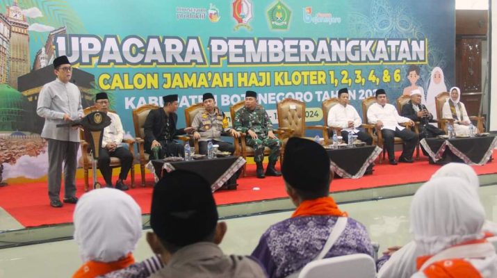 CB, Bojonegoro – Pj Bupati Bojonegoro Adriyanto bersama jajaran Forkopimda melepas Calon Jemaah Haji (CJH) Kabupaten Bojonegoro tahun 2024 di Pendopo Malowopati, Sabtu (11/5/2024).