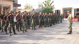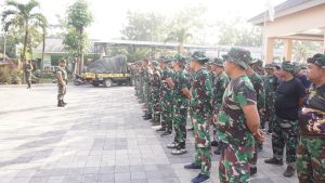 Kapten Inf Ghofur Pa Posko TMMD memimpin apel pagi kepada para anggota satgas TMMD (TNI Manunggal Membangun Desa ) ke 120 Kodim 0816/Sidoarjo di Desa Penambangan, Kamis (16/5/2024).