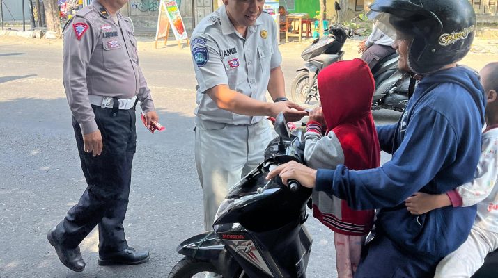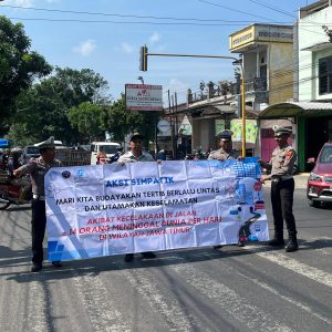 Kediri, Cahaya Baru – PT Jasa Raharja Perwakilan Kediri melalui Penanggung Jawab Bidang Pelayanan Andhe Christian berkerjasama dengan Unit Gakum dan Kamsel Polres Kediri Kota menggelar aksi simpatik dengan memberikan Snack dan Souvenir berupa Gantungan kunci yang bertuliskan Pesan Keselamatan Berlalu Lintas kepada pengguna jalan yang melintas dititik rawan laka lantas Jalan Umum Desa Wates Kediri.