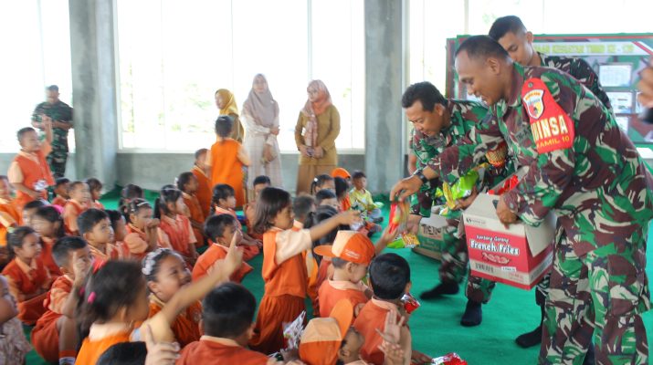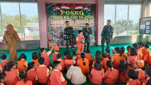 Cb Sidoarjo. Satgas TNI Manunggal Membangun Desa (TMMD) ke-120 Kodim 0816/Sidoarjo melaksanakan kegiatan pemberian sarana penggalangan (sargal) dan penyampaian wawasan kebangsaan kepada siswa-siswi TK Darma Wanita Persatuan Desa Penambangan. Senin (3/6/2024).