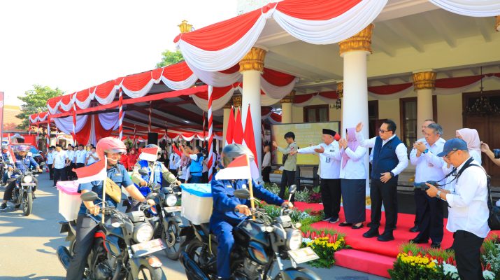 SURABAYA, 14 AGUSTUS 2024 -Penjabat (Pj) Gubernur Jawa Timur Adhy Karyono memberangkatkan 39 orang Tenaga Kesejahteraan Sosial Kecamatan (TKSK) dan dan 39 orang Taruna Siaga Bencana (TAGANA) untuk menyalurkan souvenir, sembako dan tali asih kepada perintis kemerdekaan, janda perintis kemerdekaan, dan ahli waris keluarga pahlawan nasional di halaman Gedung Negara Grahadi Surabaya, Rabu (14/8).