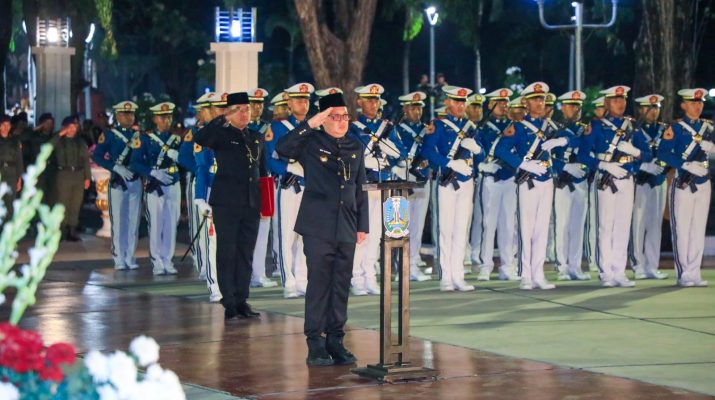 SURABAYA – Penjabat (Pj) Gubernur Jawa Timur Adhy Karyono memimpin Apel Kehormatan dan Renungan Suci (AKRS) dalam rangka Peringatan HUT Ke-79 RI di Taman Makam Pahlawan 10 Nopember, Surabaya, Sabtu (17/08) dini hari.