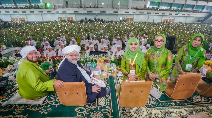 CB, SURABAYA – Ribuan jamaah Muslimat NU mendapatkan ijazah manaqib dari As Syaikh As Sayyid Afeefuddin Al Jailani yang merupakan cicit dari Syekh Abdul