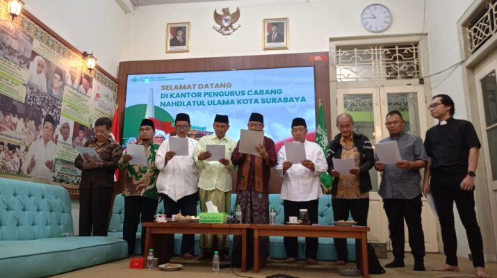 CB, SURABAYA – Pengurus Cabang Nahdlatul Ulama (PCNU) Kota Surabaya bersama tokoh lintas agama menggelar pernyataan sikap terkait perkembangan situasi sosial politik di Indonesia, termasuk dinamika yang terjadi di Kota Surabaya.