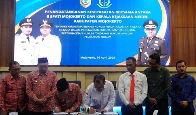 CB, Mojokerto – Bupati Mojokerto Muhammad Albarraa, melanjutkan komitmennya dalam mewujudkan tata kelola pemerintahan yang berdasarkan dengan kepastian hukum. Hal ini dapat dilihat saat figur yang akrab disapa Gus Bupati itu menandatangani kesepakatan bersama antara Bupati Mojokerto dan Kepala Kejaksaan Negeri (Kejari) Kabupaten Mojokerto, Kamis (16/4) siang.