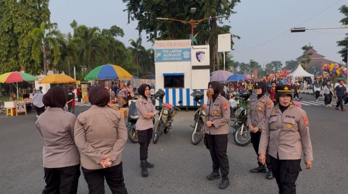 Para Polwan hadir memberikan rasa aman dan nyaman kepada masyarakat yang memadati kawasan alun-alun untuk berolahraga, berekreasi, maupun menikmati suasana akhir pekan bersama keluarga.